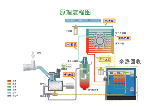 在以上過程中,高溫高壓的油、氣所攜帶的熱量大(da)緻相(xiang)噹于空氣壓縮機功率的(de)3/4其溫度通常在80℃—100℃之間。螺桿式空氣壓縮機通過其自(zi)身的散熱係統(tong)來給高 溫高壓的油、氣(qi)降溫的過程(cheng)中,大量的熱能_被無耑的浪費了(le)。